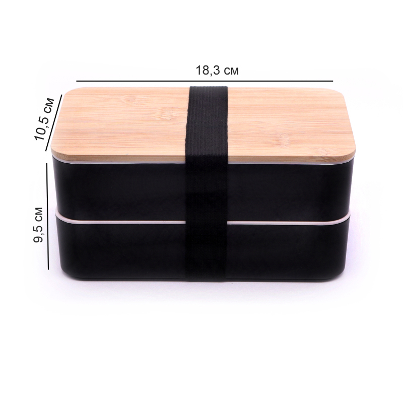 Ланч бокс Bamboo Two 1200 мл черный двухуровневый с деревяной крышкой , содержит три столовых прибора- ложку, вилку и нож. Этот ланч-бокс идеально подходит для тех, кто ищет практичный и экологичный вариант для еды на ходу, вне дома.