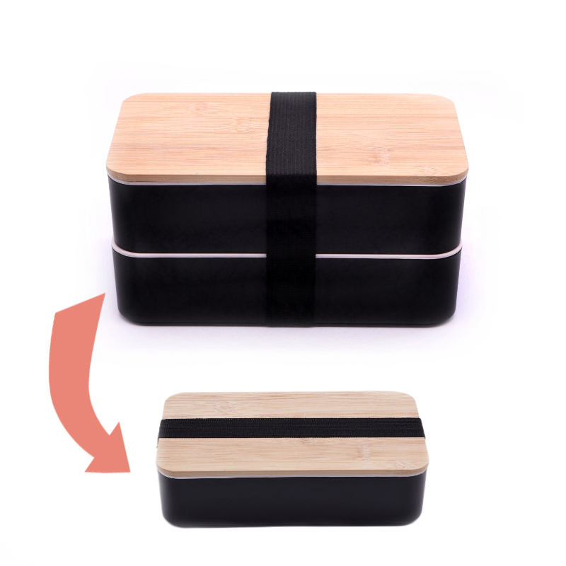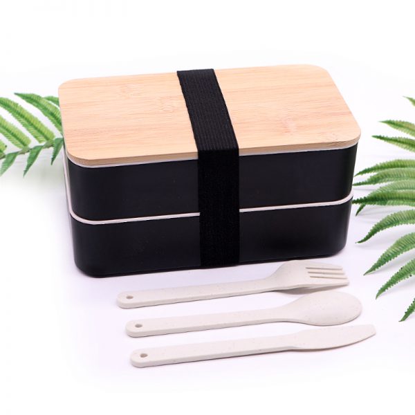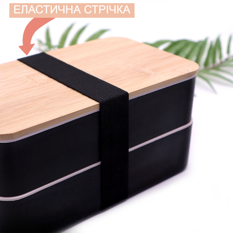 - Ланч бокс двухуровневый с деревяной крышкой и столовыми приборами Bamboo Two 1200мл черный