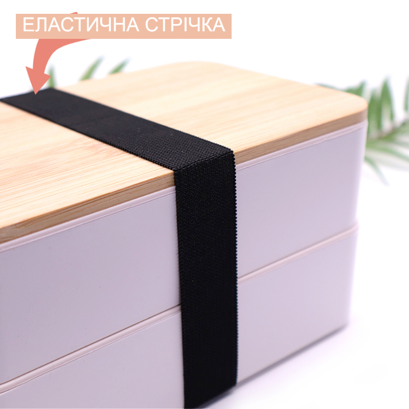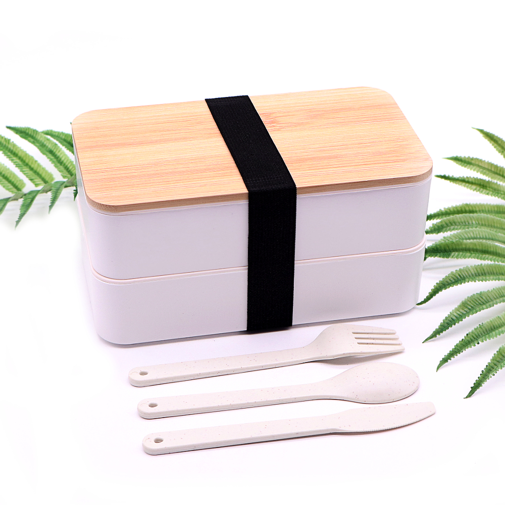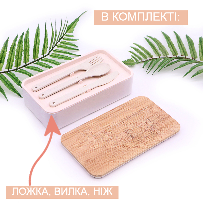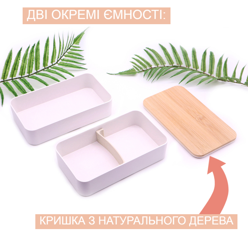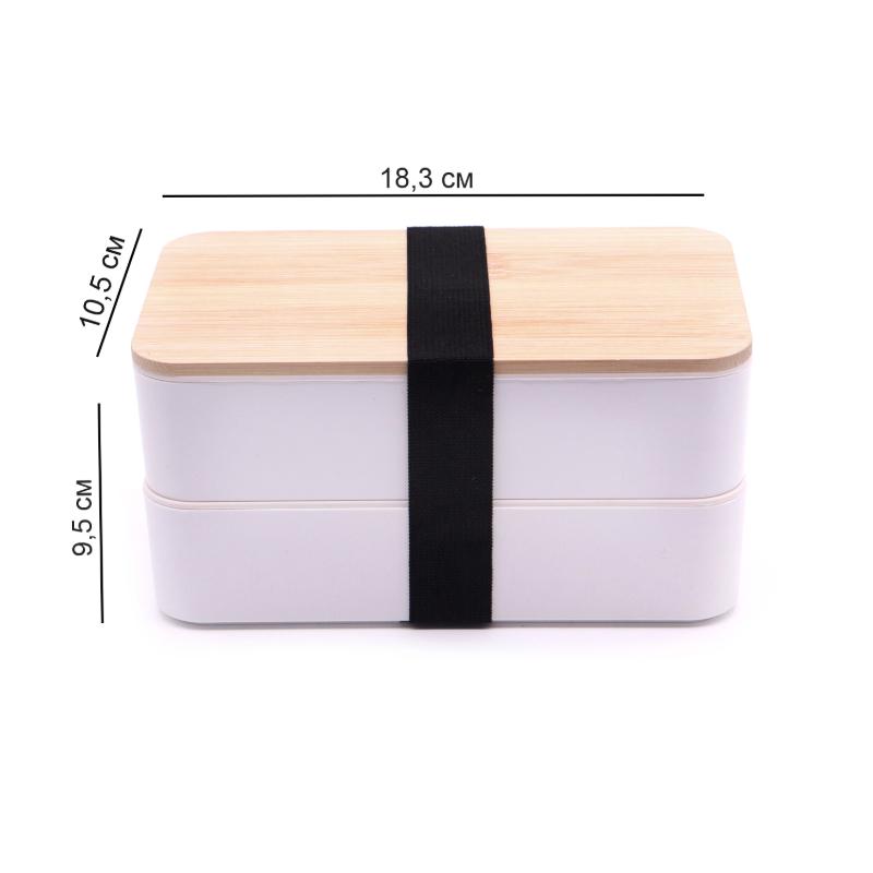 - Ланч бокс двухуровневый с деревяной крышкой и столовыми приборами Bamboo Two 1200мл белый