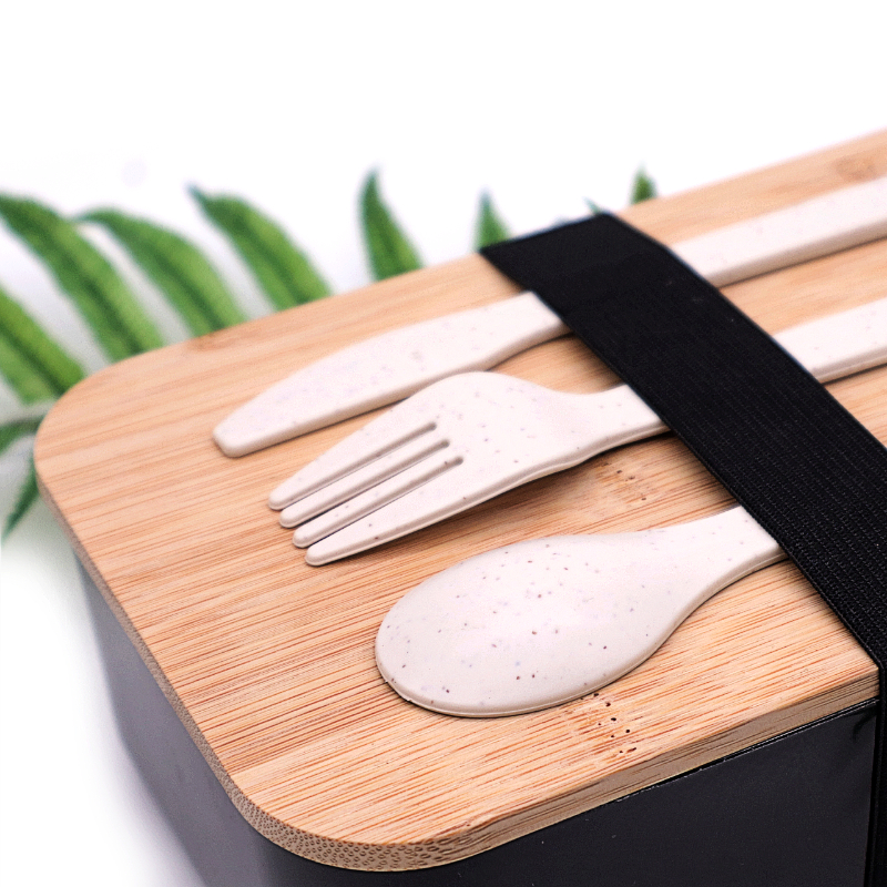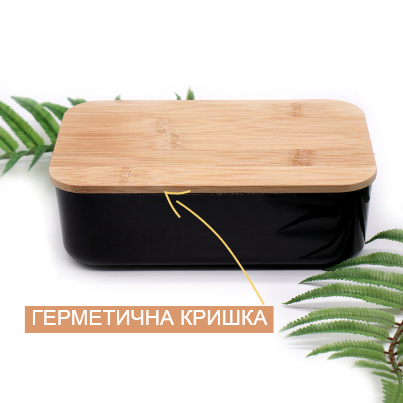 - Ланч бокс одноуровневый с деревянной крышкой и столовыми приборами Bamboo One 1000 мл черный