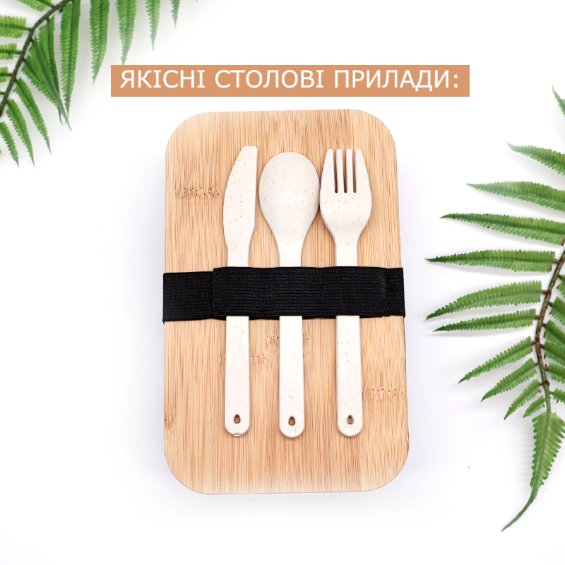 Состоит из контейнера и бамбуковой крышки. В комплект входят столовые приборы. По периметру крышки идет силиконовый уплотнитель, для лучшей герметизации. Еда в контейнере сохранит свою свежесть и неповторимый вкус.