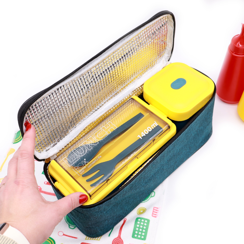 В наборе имеется ланч бокс (1400 мл), супница (550 мл) и термосумка. Оба яруса ланч бокса имеют один основной ярус со съемным разделителем и две отдельные емкости. Крышки с отверстием для выхода пара при разогреве правильно снимаются после поднятия клапана и поднятия за специальный пазик сбоку крышки . Раздельные емкости не дадут еде смешаться.