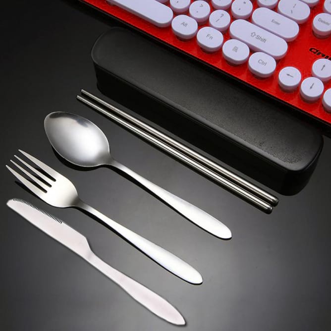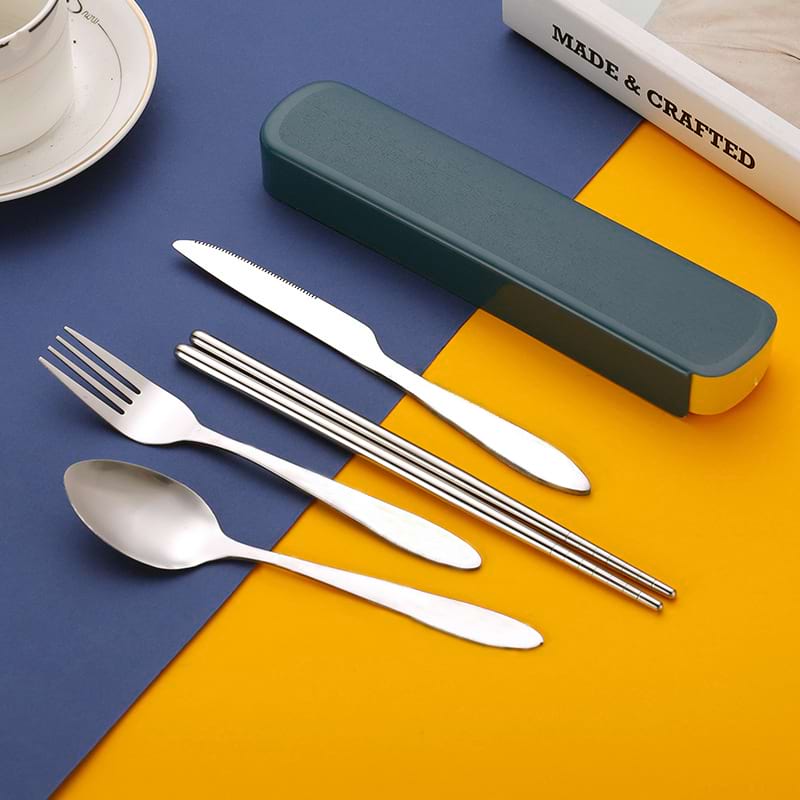 В наборе столовых приборов «Case» есть всё необходимое: палочки, ложка, вилка и нож. Столовые приборы хранятся в футляре из прочного пластика. Очень удобно брать такой набор с собой в школу, на учёбу, работу, в поездку, командировку. Все приборы сделаны из нержавеющей стали.