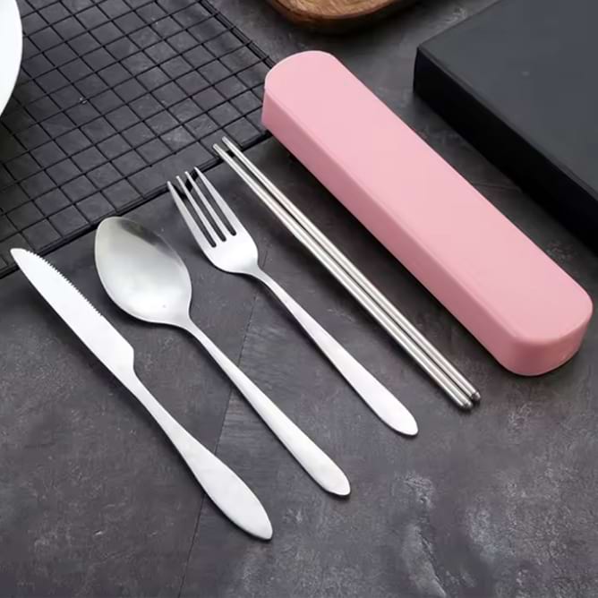 Столовые приборы ложка/ вилка/ нож/ палочки в пластиковом чехле Case – розовые
