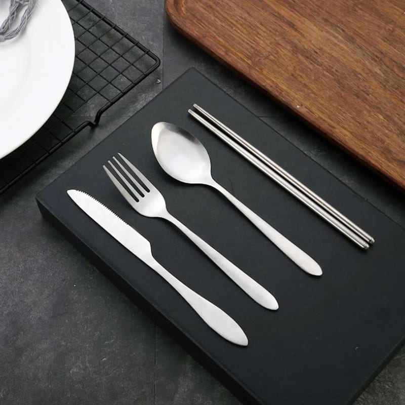 В наборе столовых приборов «Case» есть всё необходимое: палочки, ложка, вилка и нож. Столовые приборы хранятся в футляре из прочного пластика. Очень удобно брать такой набор с собой в школу, на учёбу, работу, в поездку, командировку. Все приборы сделаны из нержавеющей стали.